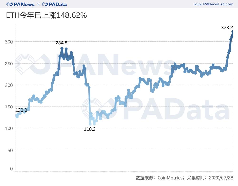 根据CoinMetrics校正后的币价数据,ETH从年初的130美元上行至目前的300美元以上,整体涨幅达到了148.62%。并且,除了2月中旬至3月中旬因受“新冠”疫情影响,ETH与全球其他主要资产一样,出现大幅波动以外,其余时间的走势基本为单边上涨趋势,尤其是7月中旬以后,上行势头明显,仅7月16日至7月27日的涨幅就达到了38.42%,8月2日火币交易所甚至一度达到了415.78美元。