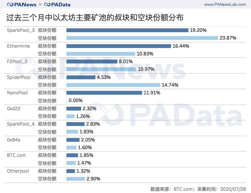 如果将Uncles Reward纳入矿工收入统计,那么根据叔块率,SparkPool和Ethermine的收入还将更高。两大矿池的叔块率分别达到了19.20%和16.44%,远远高于其他矿工。另外,NanoPool的叔块率也超过了10%,属于较高水平。