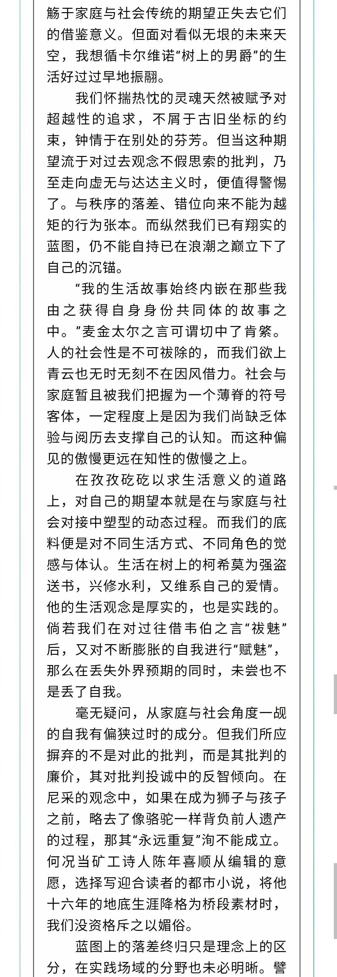 它的每一句话都围绕着个人的人生理想和家庭社会的期待之间的落差和错位论说,文章从头到尾逻辑严谨,说理到位,没有多余的废话,所有的引证也并非为了充门面或填充字数。