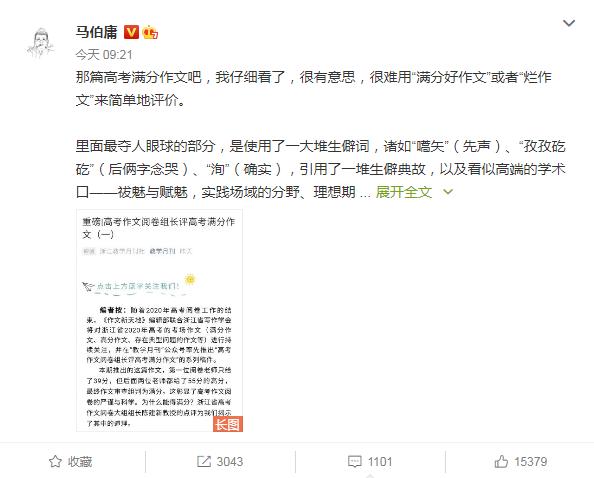 作家马伯庸则认为,最让人称奇的是,满分作文作者用了一大堆生僻词和生僻典故,但都用对了地方,“这说明考生本人的知识面和阅读量,确实远超同侪,这是很值得佩服的一点。”
