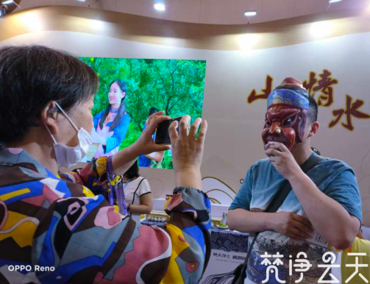 展馆大门中间,古朴的手绘铜仁地图、沙盘上云雾缭绕的梵净山浓缩自然景观,展馆侧面巨大的石阡非遗蜡染布都非常惹眼,聚集了一批又一批“门外客”,拿着专业的“长枪短炮”,选取各种角度,以“桃源铜仁”为背景,以“文创铜仁”为元素,沉醉在艺术创作当中。
