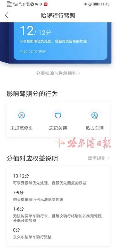 如果用户的骑行驾照分被扣到了0分既“失信”等级,则无法使用哈啰单车。