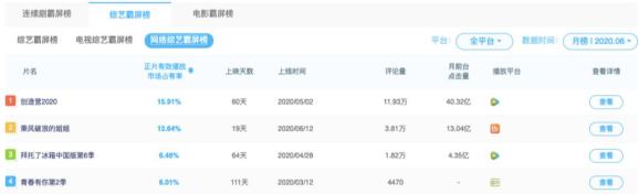 在艺恩数据上,《乘风破浪的姐姐》自上线起,一直占据播映指数排行榜周榜第一的位置;在骨朵热度指数排行榜上,《乘风破浪的姐姐》自第26周(6月22日—6月28日)起,连续在周榜排名第一;在云合数据上,6月网综有效播放量上线19天的《乘风破浪的姐姐》仅次于《创造营2020》排在第二位。