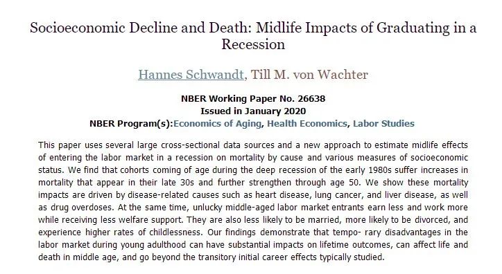 今年1月,美国西北大学教育与社会政策学院的教授汉尼斯·施万特发表了一篇论文,发表在《劳动经济学杂志》上,原文标题为Socioeconomic Decline and Death :Midlife Impacts of Graduaring in a Recession (翻译成中文就是《经济衰退与死亡:经济衰退中的毕业生的中年冲击》),为我们揭示了这一问题。