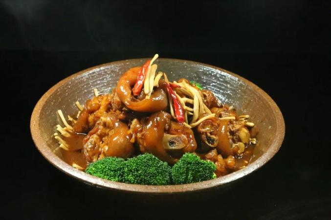 “金针富足”选用传统农家饲养1年以上的大猪脚,骨健、筋多、肉强,用农家大锅文火烹制1.5小时,出锅后再加入黄花菜干翻滚入味,既有清新野菜香,又有醇浓肉香。黄花菜利尿、平肝,猪蹄富含胶原蛋白,利咽、发奶、强身健体。