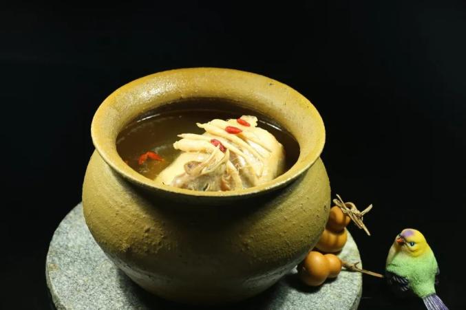 “黄精凤鸟”是是景宁宴席上不可或缺的佳肴。畲族人称大公鸡为凤鸟,是最主要的生活、祭祀、喜庆菜品。制作黄精凤鸡,需选取两三斤重左右的土鸡。放入锅中过沸水取出后放入大漈罐中,加入中药黄精,炖制而成。