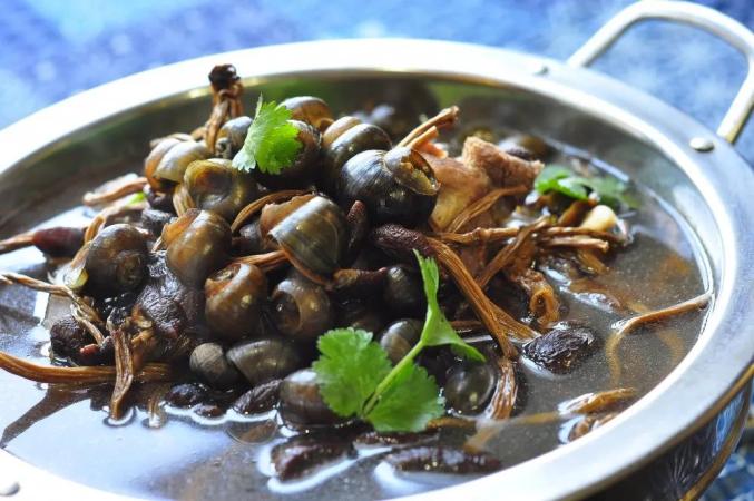 明清时期,有户人家想给自己的孩子和家里的老人补补身子,但却因家中经济困难,买不起猪肉、牛肉等食材,他发现家附近的河中有不少田螺,因山地海拔高,气候适宜,这些田螺肉质鲜美,营养丰富,与猪筒骨、茶树菇一起熬制成煲,能够给家人补充营养。这样的做法也就一传十,十传百地流传开来,一直延续至今成为招待客人的菜肴。