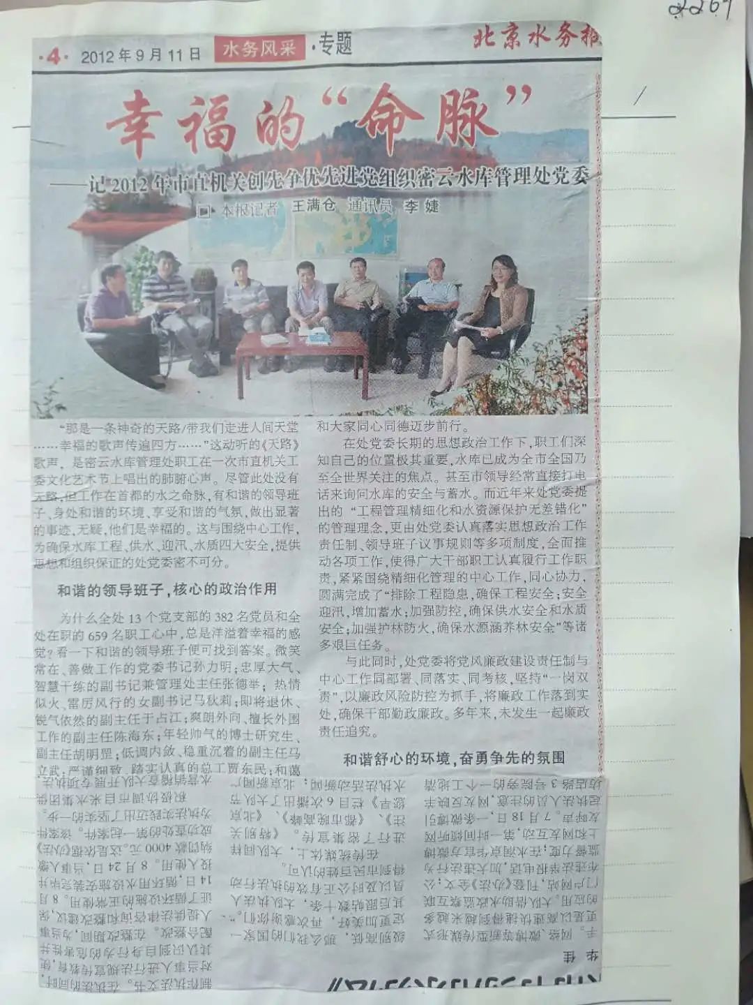王满仓,男,70岁,原北京市水务局《北京水务报》编辑。他从2005年至2016年10余年一直关注、热爱和讴歌密云水库,在《北京日报》《中国水利报》《中国南水北调报》《北京水务报》等多家媒体上刊发了《“生命之水”的眼睛》《凝聚丹心护明珠》《“缸”里水多人心安》等100余篇稿件,多次到密云水库实地采风,发表的文章大到喜迎密云水库建库50周年的《平安,京城水焦点》,小到水库管理处林业管理所内湖管理站的《“山大王”们,年年过节不回家》。王满仓说他多年来坚持时刻关注密云水库的所有动态消息,都源于他对这一首都供水“稳定器”的敬仰与热爱,也融进了他对首都生态的“金名片”一片浓浓深情。