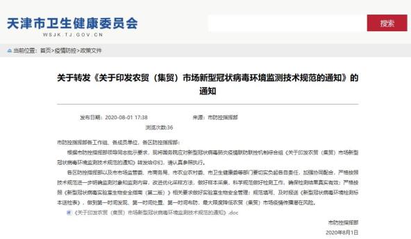 近日,天津市防控指挥部发布通知,转发国务院应对新型冠状病毒肺炎疫情联防联控机制综合组《关于印发农贸(集贸)市场新型冠状病毒环境监测技术规范的通知》。