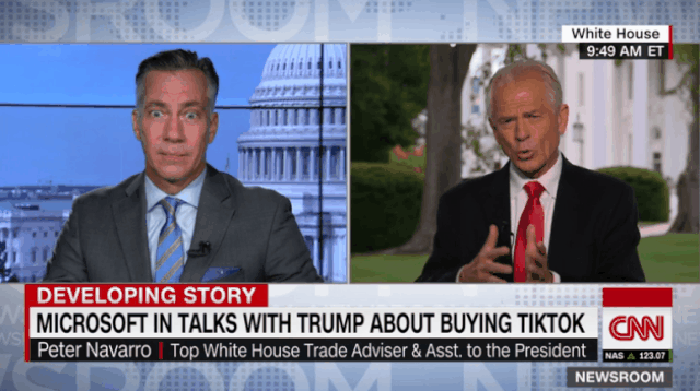 8月2日上午,纳瓦罗接受了CNN“新闻编辑室”(Newsroom)栏目的专访。主持人开场就向纳瓦罗提问:如果真像特朗普政府和官员所说,TikTok因与中国联系紧密而具有“安全问题”,那么微软收购以后,TikTok是否会变得更为“安全”?
