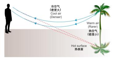 “海市蜃楼”是对这个现象的教科书式解释:由于夏季公路温度高,越靠近路面的温度越高,空气受热膨胀,密度越来越小,光线的折射率也随之减小。远处物体反射的光线经过多轮折射到达地面,发生全反射,再经过一轮折射进入人眼。对于人眼来说,光线始终沿直线传播,于是就有了物体倒映在路面上的错觉,这种类型的海市蜃楼被称为下蜃景。