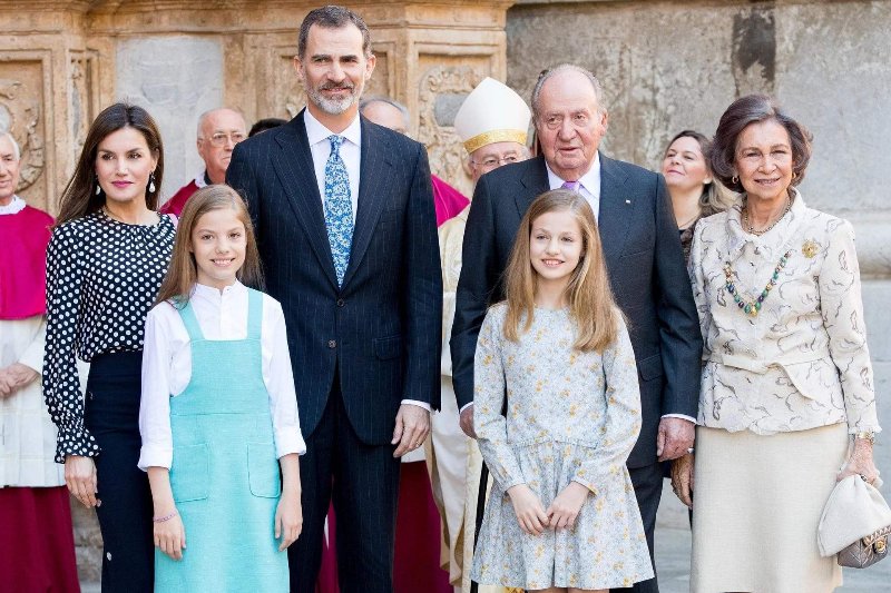 从左至右:莱蒂齐亚王后、费利佩六世国王、胡安·卡洛斯一世和夫人索菲娅。前排两个女孩是费利佩六世和莱蒂齐亚王后的两个女儿。