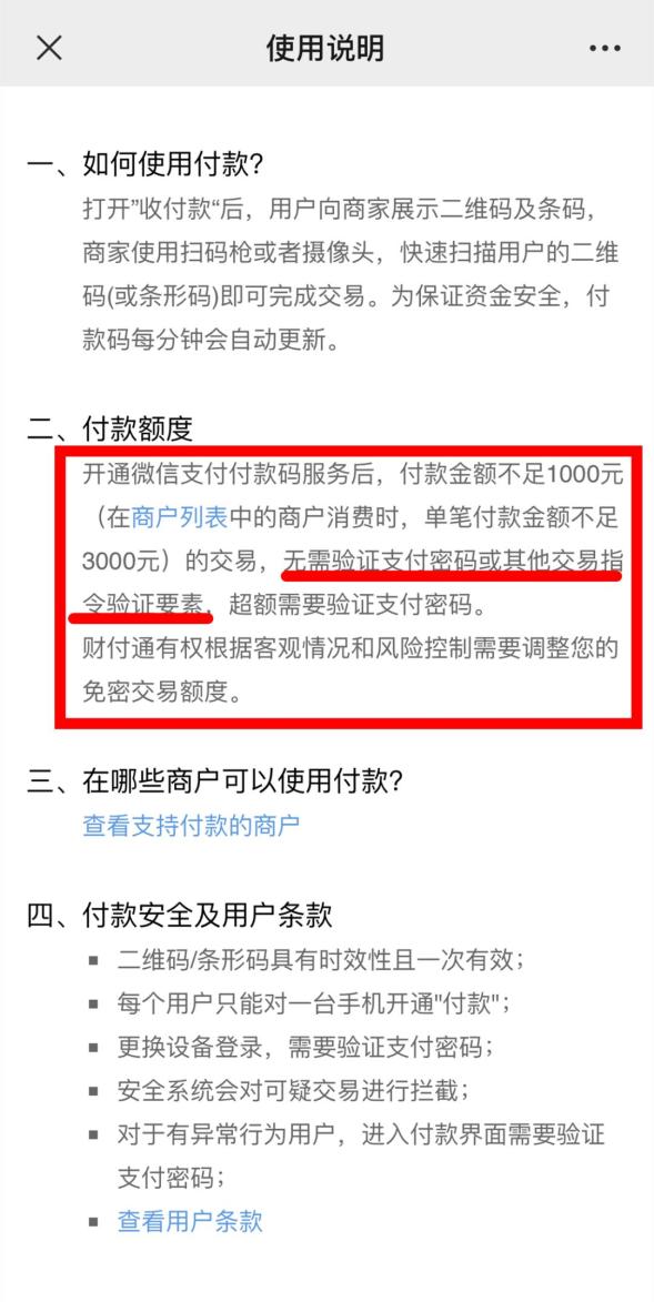 “开通微信支付付款码服务后,付款金额不足1000元(在商户列表中的商户消费时,单笔付款金额不足3000元)的交易,无需验证支付密码或其他交易指令验证要素,超额需要验证支付密码。”