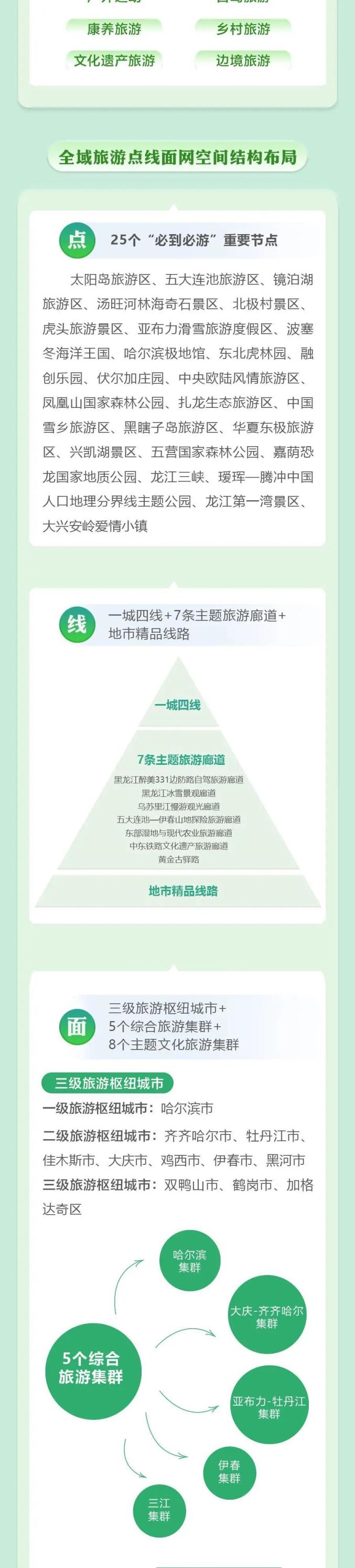 谋划了一、二、三级旅游枢纽城市的空间结构布局,哈尔滨、大庆—齐齐哈尔、亚布力—牡丹江、伊春、三江等5个综合旅游集群