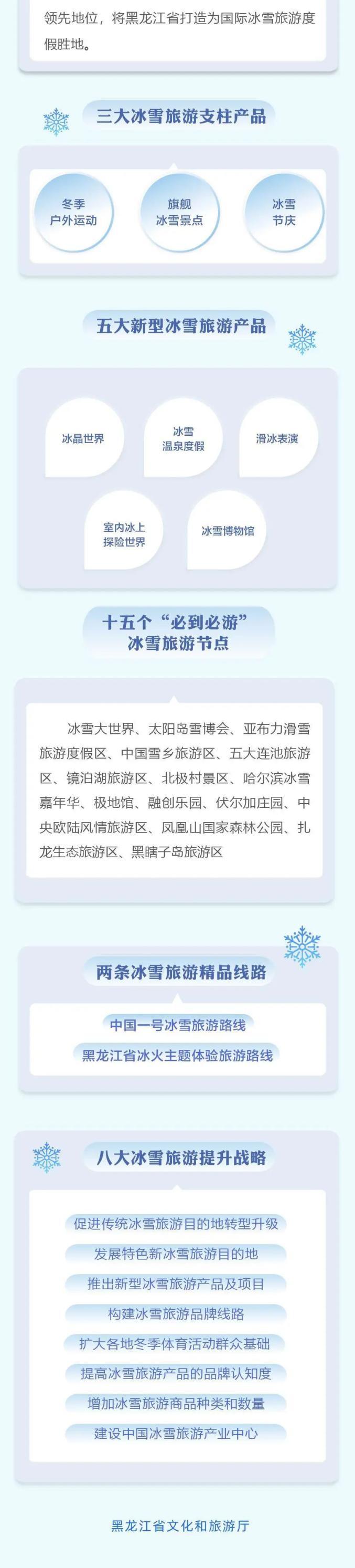 《黑龙江省冰雪旅游产业发展规划(2020-2030年)》以打造国际冰雪旅游度假胜地为目标,以培育新型冰雪旅游产品,提高我省冰雪旅游体验性、参与性、娱乐性为重点,打造5个符合国际游客需求的四季旅游目的地,建成5个全年运营的冰雪旅游旗舰景区,向游客提供全谱系冰雪旅游产品,力争到2030年,全省冰雪旅游人数突破2亿人次,冰雪旅游收入突破2000亿元。提出了重点发展冬季户外运动、旗舰冰雪景点、冰雪节庆三大冰雪旅游支柱产品,实施促进传统冰雪旅游目的地转型升级、发展特色新冰雪旅游目的地、推出新兴冰雪旅游产品及项目、构建冰雪旅游品牌线路、扩大各地冬季体育活动群众基础、提高潜在客源市场品牌认知、增加冰雪旅游相关的纪念品(衍生品)品类和数量、建设中国冰雪旅游产业中心等冰雪旅游提升八大战略。谋划了开发冰晶世界项目、冰雪温泉度假、冰秀表演、室内冰上探险世界、冰雪博物馆等新型冰雪旅游产品,升级亚布力滑雪旅游度假区、扩大中国雪乡地理区域、打造“中国圣诞文化第一村”品牌、建设中国冰雪旅游产业中心等具体发展策略。设计了构建中国一号冰雪旅游路线、黑龙江省冰火体验旅游路线2条冰雪旅游品牌线路和冬季冰雪旅游“必到必游”的15个重要节点等。