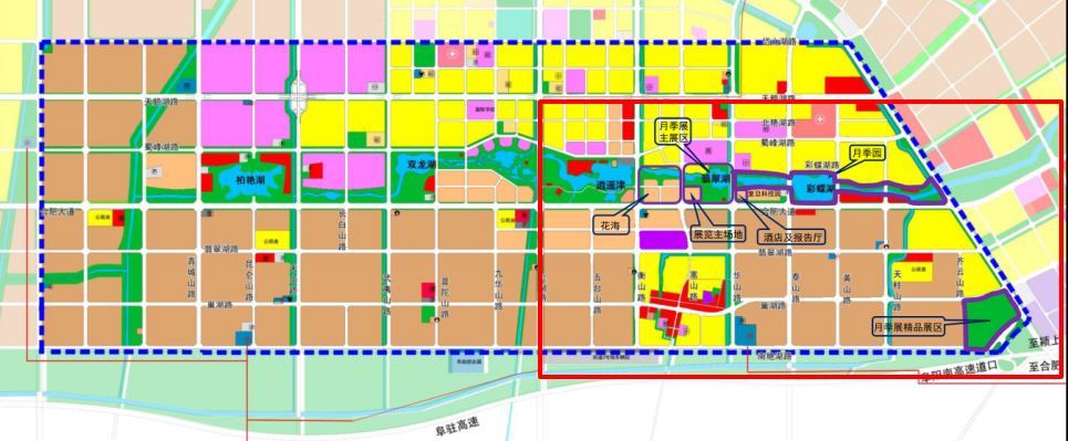本届月季展展园三个片区总面积约1500亩,主展区设置在园区“五湖四海”翡翠湖段,精品展区设置在颍淮花园,月季园包括彩蝶湖公园、芦桥花海、迎宾公园等。