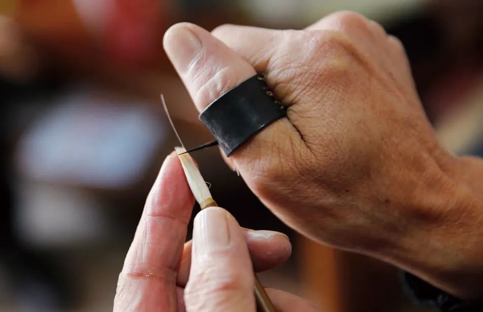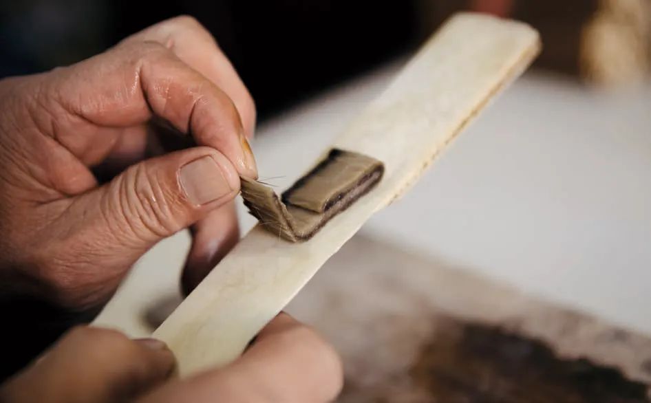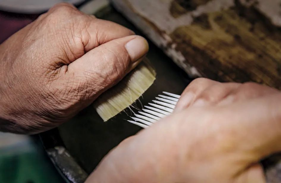 以做一支兼毫(狸毫、野猫毛)小楷笔为例。狸毫软,野猫毛稍硬些,混合起来是做笔锋的好料。把两种毛按3:7 掺和在一起,把根部排列整齐,放在特制的牛骨梳(3.5 厘米宽、28.5 厘米长,一端有5 厘米长的梳齿,一端为光平板,一头牛前腿上部的牛骨只能做成两把)上(倒毛),捏着毛梢部,蘸水后用牛骨梳反复梳理毛根部,把绒毛梳出来挂在毛根部(挂角)。然后用左手拇指、食指紧紧地捏住毛根部的绒毛,蘸着水反复梳理毛梢部(梳毛)。梳毛是做笔人的基本功,在反复地梳洗、浸润和淘汰中,杂乱而蓬松的毛被逐渐地修整,最终成了一束结实柔软、“听话”抱团的毛锋。这是用到最多的工序,每天梳理上万遍是常事。在梳毛时要不停地蘸水,所以说打铁人是火里求财,做笔行当是水里求财。
