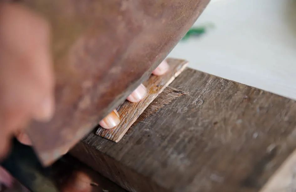 等毛锋越梳越光滑,没有绒毛、杂毛再梳出来时,把毛锋在齐灰盆中蘸一下(齐灰是用百年老房子砖缝中的纯石灰,蘸水在细砂石上研磨、过滤、沉淀后调成的糊状石灰水,有一定的黏稠度,可使毛锋抱团不乱),然后把牛骨齐板(和牛骨梳类似,但没梳齿)放在桌上,一头顶着腹部,左手仍捏住毛根部把毛锋放在齐板的右边缘上,右手拇指按住毛锋,左手一点点抽动,10 多次后,毛锋便贴着齐板右边缘整齐地排列在上面(齐毛,就是把毛锋对齐。若毛锋在齐板上不太齐时,用齐板在齐石上轻轻敲击,让笔锋对齐。刚抽出的锋长,最后抽出的锋短。如果求质量,把齐板上前1/3 锋做成好笔;若求数量,把前2/3 锋做成笔。笔的质量、数量,笔毛的浪费度与本道工序关系很大)。小心地把抽出来的全部毛锋滑下放在木案上,根据做笔需要和笔锋长短,取出合适的尺子(0.4 厘米厚、7 厘米长、宽窄不一的木板),按在毛锋上用切毛刀(和切菜刀相似,刀刃锋利)切去尺子以外的毛根部分(切毛)。
