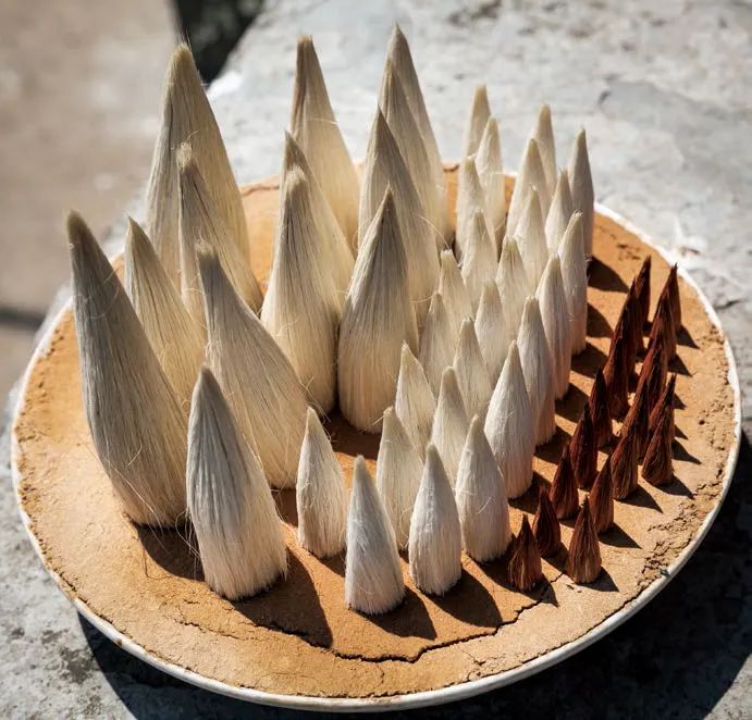 每种毛都有独特的属性,做笔人要耐心专注、因材施技。动物毛油脂多,脱脂不好,制作毛笔时容易手滑,写字时会出现漏墨现象。胡羊毛买回来时根部大都粘连在一起,先要撕开(撕毛)对齐根部,在手心里握成一大撮,放在生石灰水中泡一周后(泡毛),毛根处发黄或发黑了才行。狼毫只敢在生石灰水中泡3 个小时,而狸毫、野猫毛、马毛不用泡。