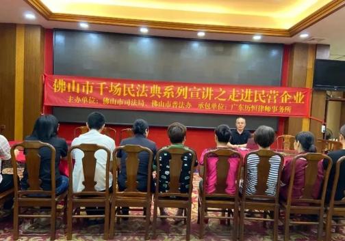 广东历恒律师事务所先后走进广东中旅(佛山)旅行社有限公司、广东君莱酒店有限公司、广东樱奥厨具有限公司等企业,通过以案说法的形式,向企业及员工开展民法典宣讲主题活动,并详细听取企业负责人员的情况介绍,审核企业内部规章制度,逐条审定企业各类合同,为企业进行全面的法治体检。