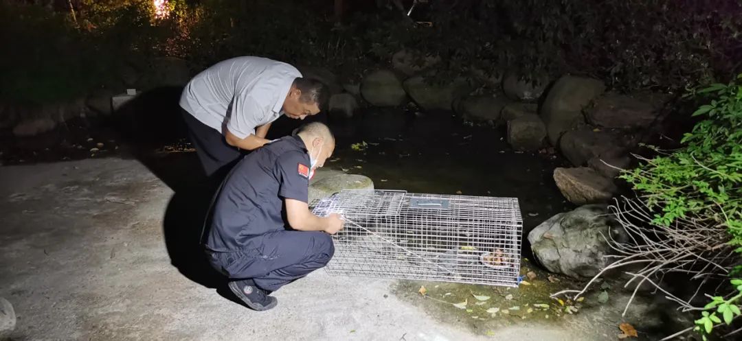 准备妥当,物业保安队长张西华打着手电筒,领着物业人员,开始在小区里安置笼子。保安将一个笼子摆放到了绿化带深处……6个笼子一一摆放完毕,物业人员称他们会每隔一个小时巡查一次,一旦捕获会重新安置笼子,提高诱捕效率。“笼子也不能每天放在同一个地方,貉的警惕性很高。”张西华说。