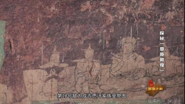 阿尔寨第28号窟中还有一副成吉思汗家族受祭图。画幅长120厘米,宽50厘米,场面恢弘,共有大小人物上百人,共分4组,将一代天骄成吉思汗与草原宝藏阿尔寨石窟密切地联系了起来。