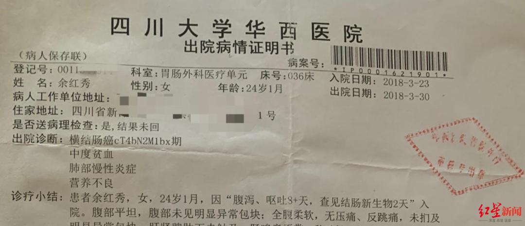 好运并没有眷顾这个家庭,同年3月,日夜照顾妈妈的余红秀突然肚子痛到不能走路,回到当地医院检查确诊为结肠癌,后来在华西医院以危急状态入院手术。