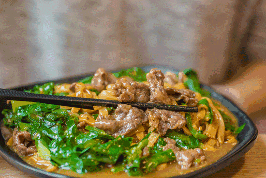 牛肉用沙茶酱、酱油、生粉等腌渍入味,再把芥蓝切小一起炒。浓浓的酱汁裹着芥蓝和牛肉片,做为炒粿条的浇头,或者配米饭都是一绝!