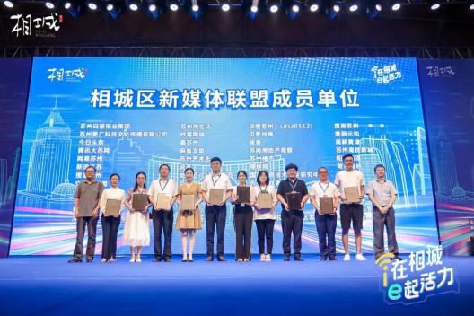 ▲相城区新媒体联盟顾问苏州日报报业集团党委副书记、副社长常新、苏州广播电视总台党委委员、副台长王晓雄授牌