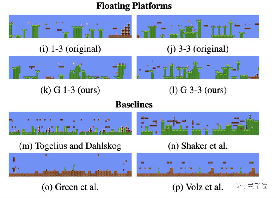 可以看出,与超级马里奥的原生关卡相比,TOAD-GAN生成的关卡在保留了风格的基础上,产生了不同的元素组合方式。