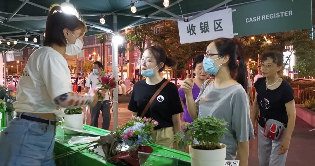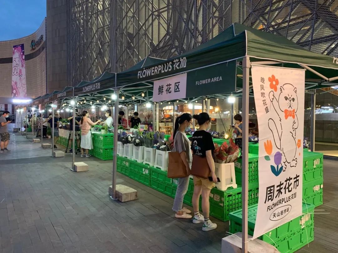 “花+天山街市”已经进行到第二周,主办方根据上周情况及时做了一些调整。帐篷上挂起了一串串的迷你夜灯,映照出夜市的浪漫氛围。夏天就喜欢这样的露天夜市~~