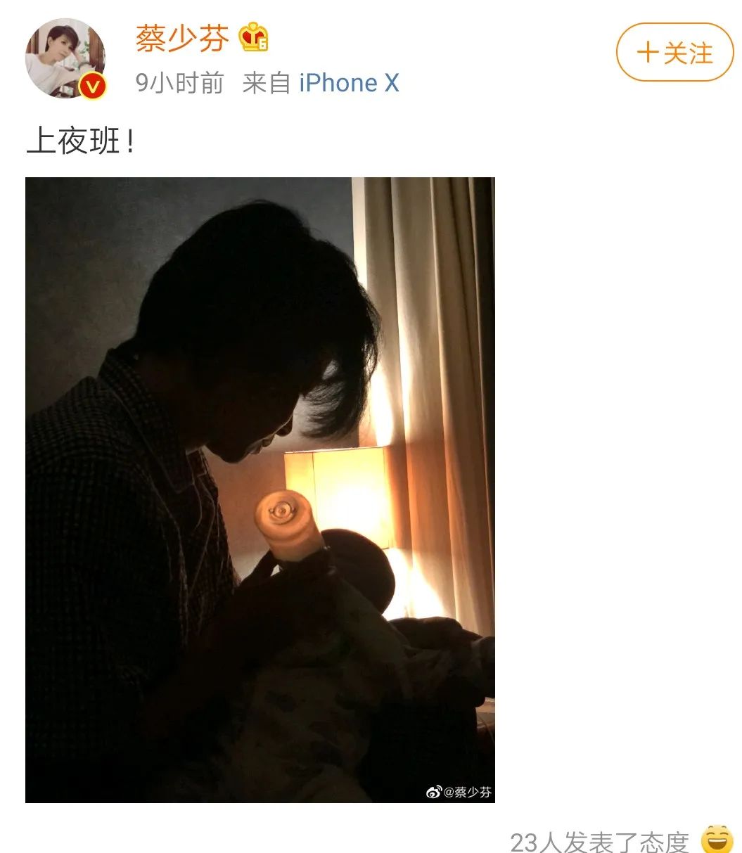 前段时间蔡少芬晒出老公张晋半夜给娃喂奶的照片: