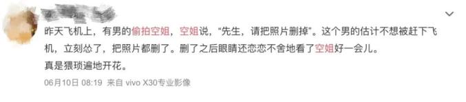 有的是趁人不注意遮遮挡挡拍一张,也有胆大的直接把手机怼在空姐脸上,甚至还出现一些猥琐恶意的拍摄角度。