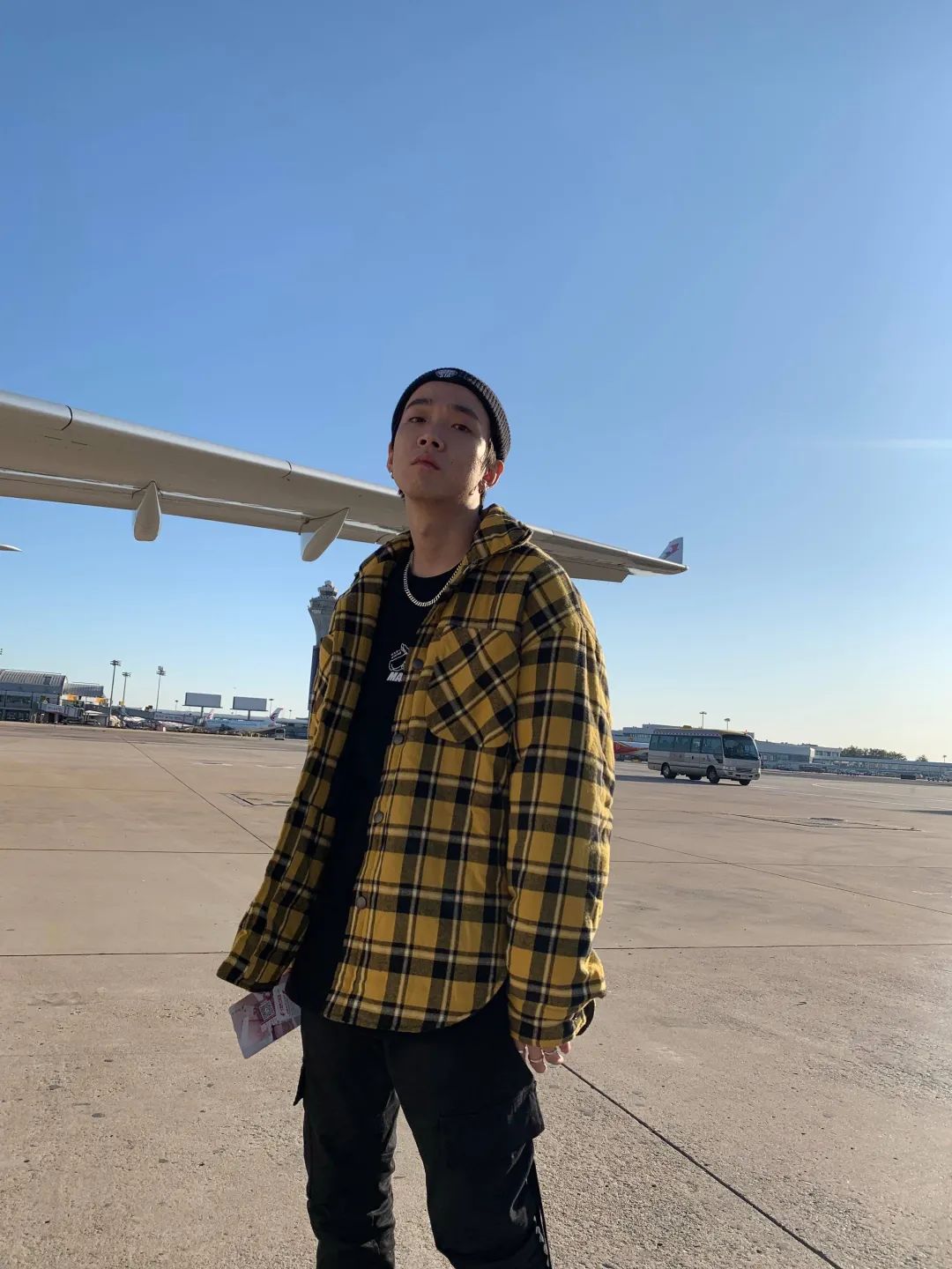 整体look以黄色和黑色为主