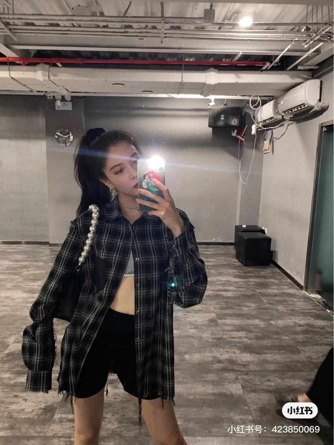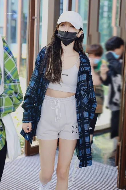 而且娇小身材在宽松的格纹衬衫下