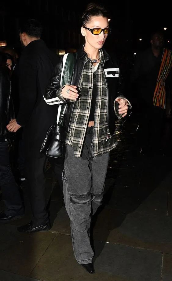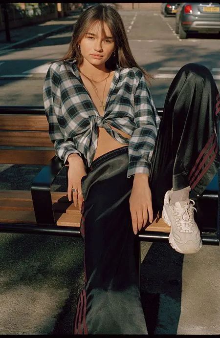 将一身工装感的格纹衬衫造型
