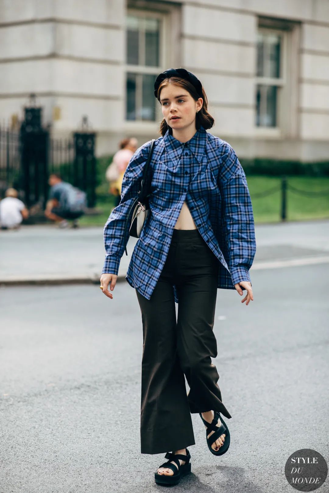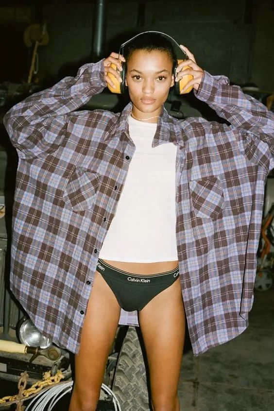 oversize格纹衬衫下恰好的露肤度