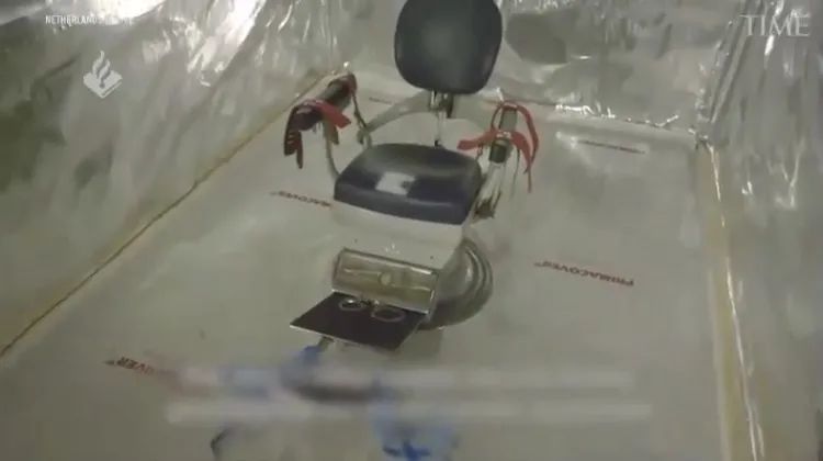 这个所谓的酷刑室里设置了一个牙医手术椅;手术椅的扶手和脚踏板上,各设置了捆绑的绳索和脚铐。