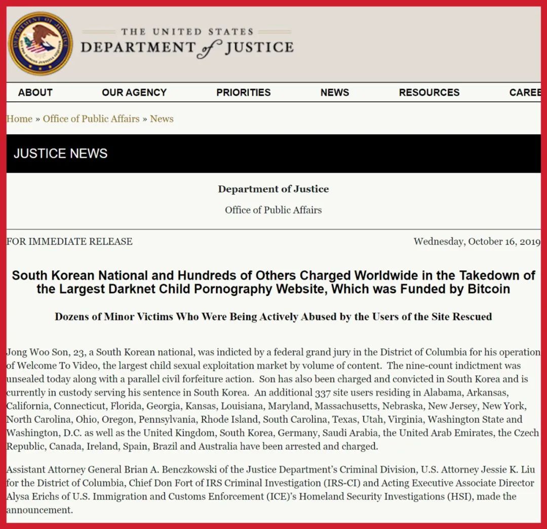 根据美国司法部(Department of Justice)2019年10月16日的一份声明表示:暗网上有相当一部分资金利益来源于未成年色情虐待影片。