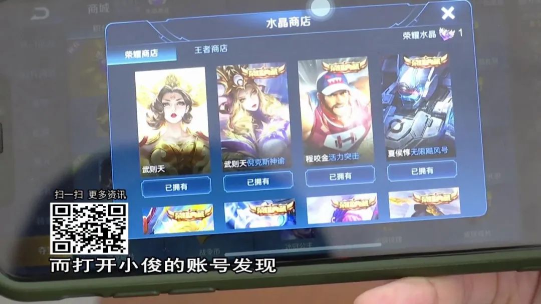 “特搜”打开了小俊充值的游戏,发现某些程序的确需要充钱进行,而他几乎集齐了多款限量版皮肤和英雄。