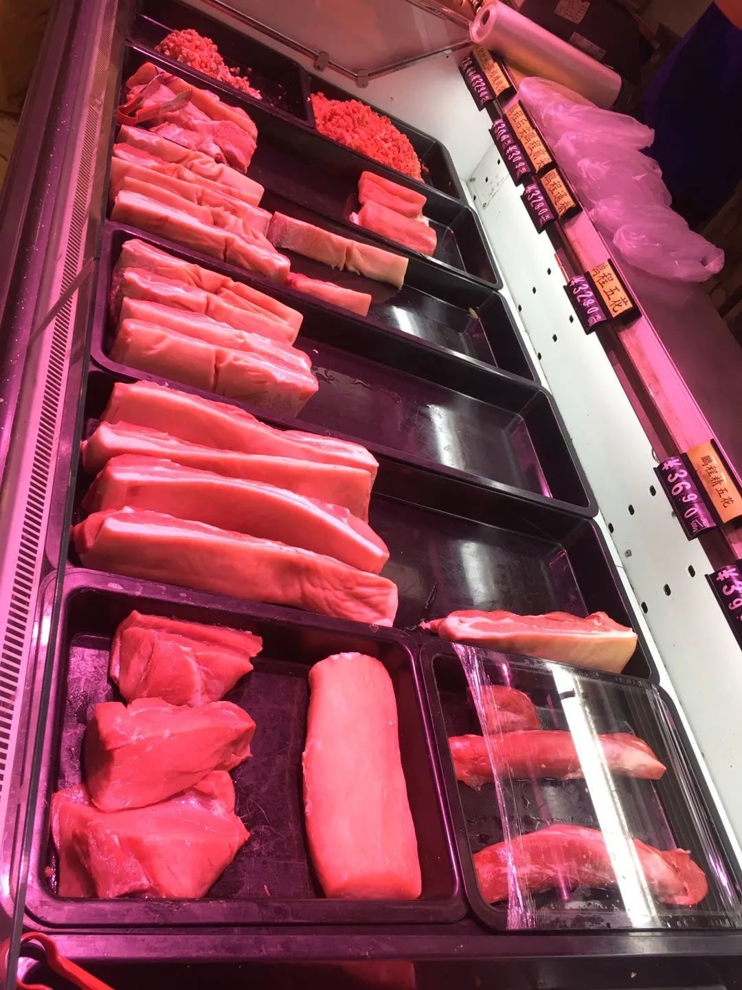 卖猪肉的柜台前,光顾的顾客依然在翻来翻去挑选着自己所需要的各类肉产品,摊位挂着价格表,展示了当天猪肉的价格。