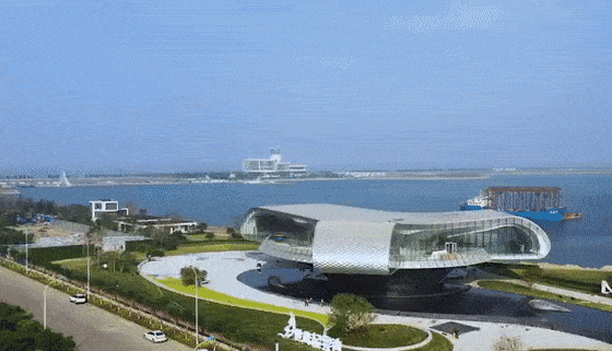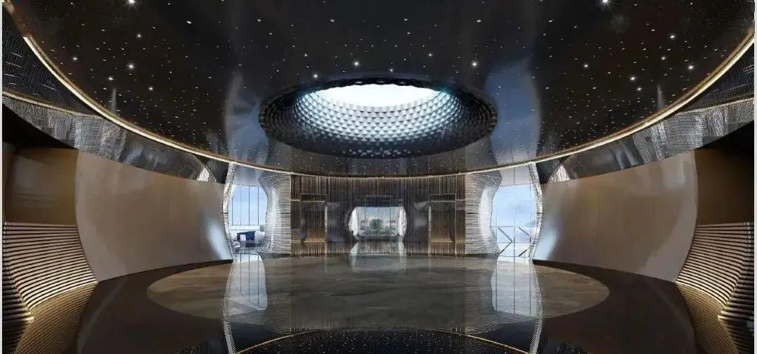 湾区鸟瞰。二楼层可观世茂起雲湾内湾,顶面星空的投影、巨幅鸟瞰全景沙盘和超大的Umax裸眼3D碗幕LED屏,带来视觉冲击宣传片,空间灵动柔美,生机盎然。