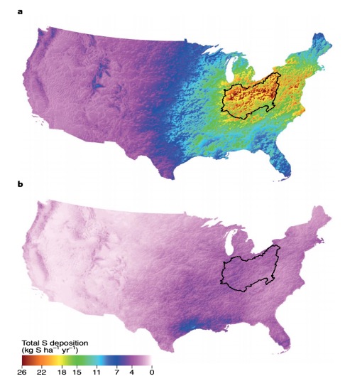 从历史上看,化石燃料的开采与燃烧曾导致大量活性硫释放到大气中,引起了1960年代、1970年代的酸雨问题,以及美国东北部和欧洲的森林和水生生态系统退化,严重损害了生态环境质量和公共健康。在美国,有关该问题的研究促使《清洁空气法》及其修正案的实施,该法对化石燃料引起的空气污染进行管制,并将美国大气中的硫沉积量降低至工业化前的水平。