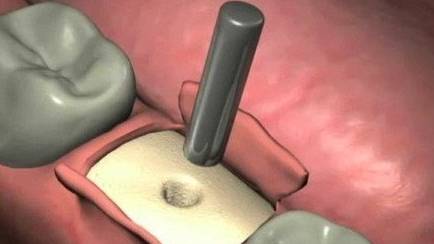 正式开始种植牙手术。在牙槽骨上制备一个孔,植入人工种植体。将牙骨床内严密缝合,大约一个星期后可以拆线。(这次大概2个半月--3个月)