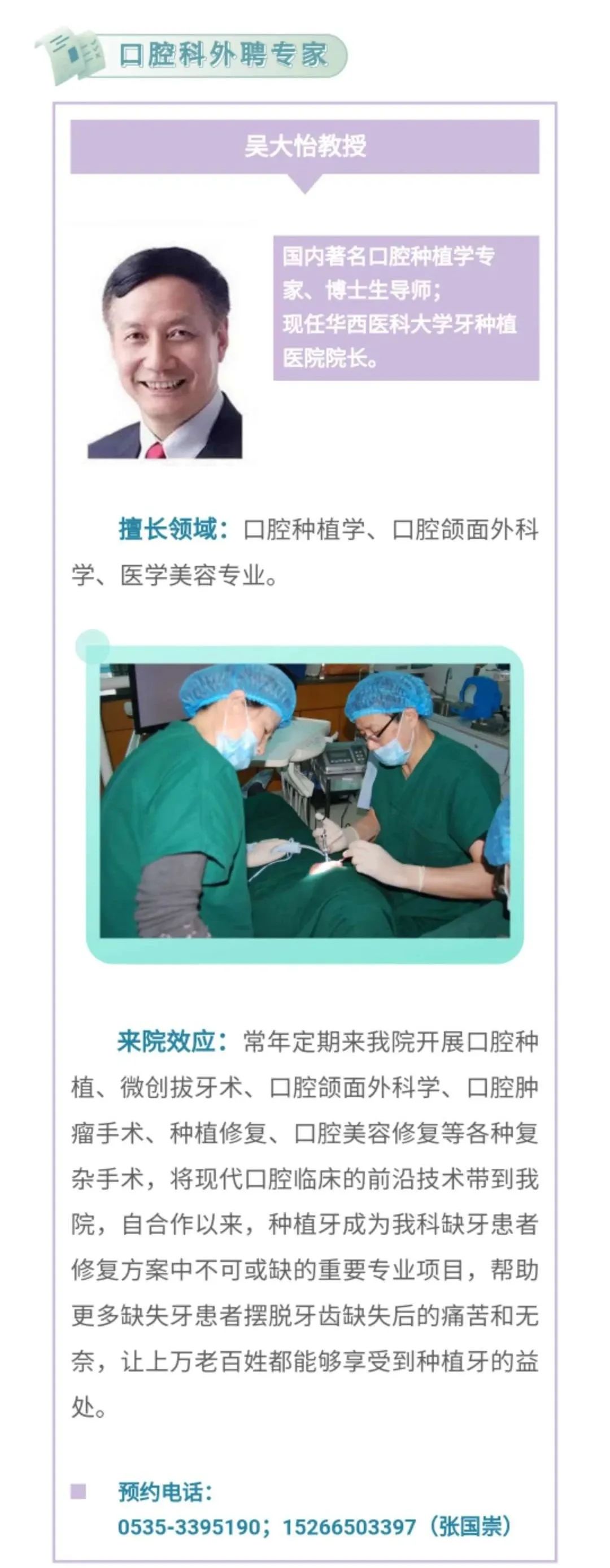 口腔科作为我院的特色科室之一,擅长口腔修复、口腔种植、牙颌畸形矫治、牙周病、牙体牙髓病的治疗以及微创无痛拔牙等,科室常年邀请国内著名口腔种植学专家、博士生导师吴大怡教授前来坐诊,并规范开展微创种植牙技术,为广大患者提供高质量的口腔医疗服务。