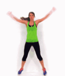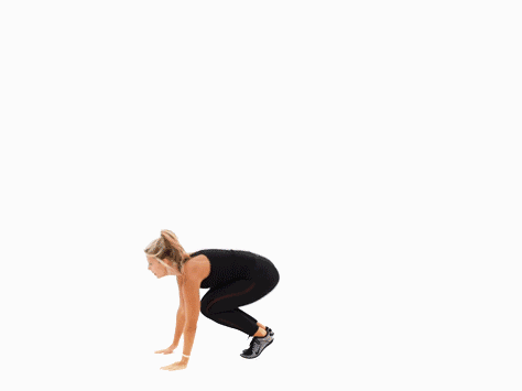 ③收回双腿,双手向头部上方伸直,同时向上跳跃,落地后,借助惯性重复上一个动作。