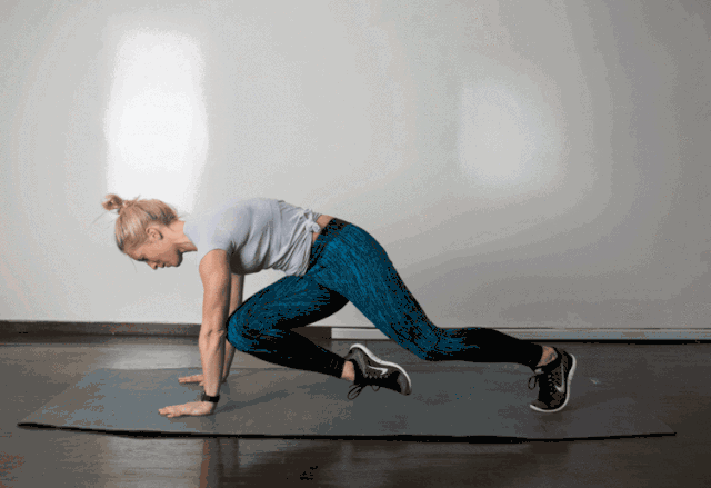 ②身体下蹲,双手撑住地面,双腿向后蹬,脚尖撑地;