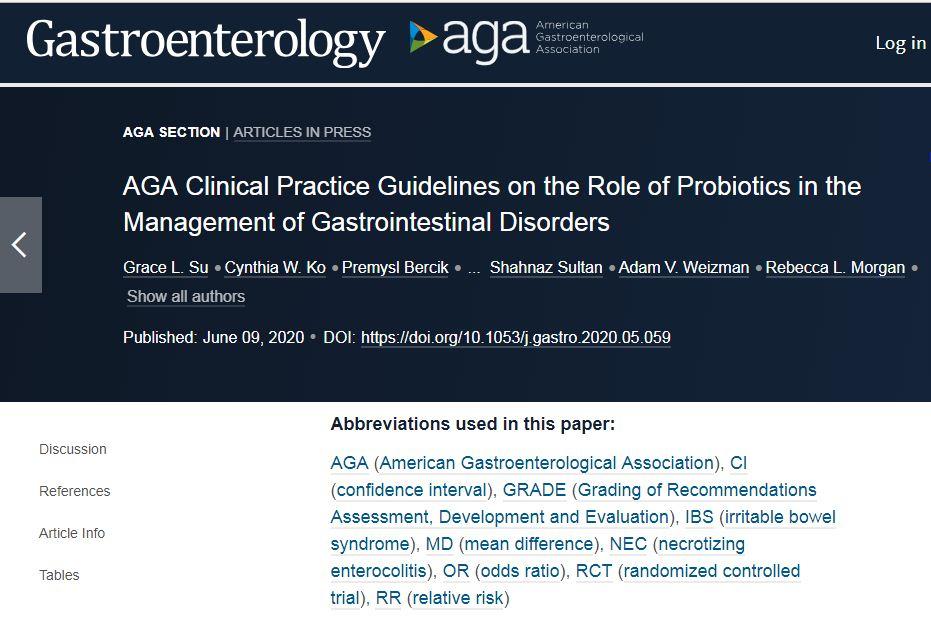 [1] Su GL, Ko CW, Bercik P, et al. AGA Clinical Practice Guidelines on the Role of Probiotics in the Management of Gastrointestinal Disorders [published online ahead of print, 2020 Jun 9]. Gastroenterology. 2020;S0016-5085(20)34729-6.