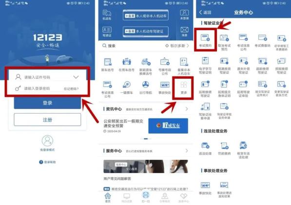 1.参加驾考的学员下载“交管12123”手机APP,实名认证后点击“更多”,进入业务中心,选择驾驶证业务中的“考试预约”项目,参加驾考预约。