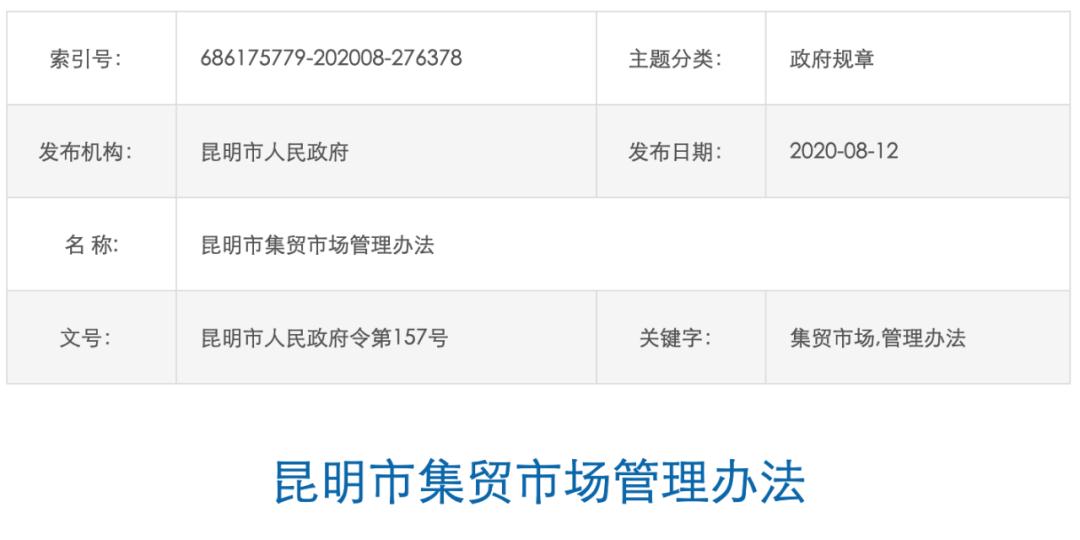 8月12日,昆明市人民政府官网发布《昆明市集贸市场管理办法》(下称《管理办法》),对市场管理原则、规划与建设具体规定、主城区实施名录管理的规定等内容进行明确。进一步促进集贸市场建设,规范市场经营管理,维护市场交易秩序,保障市场开办者、场内经营者和消费者的合法权益。《管理办法》自2020年9月11日起施行。